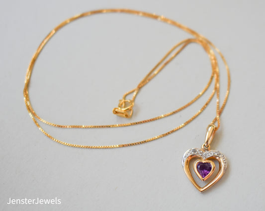 Vintage 14k Yellow Gold Amethyst and Diamond Heart Necklace 18"