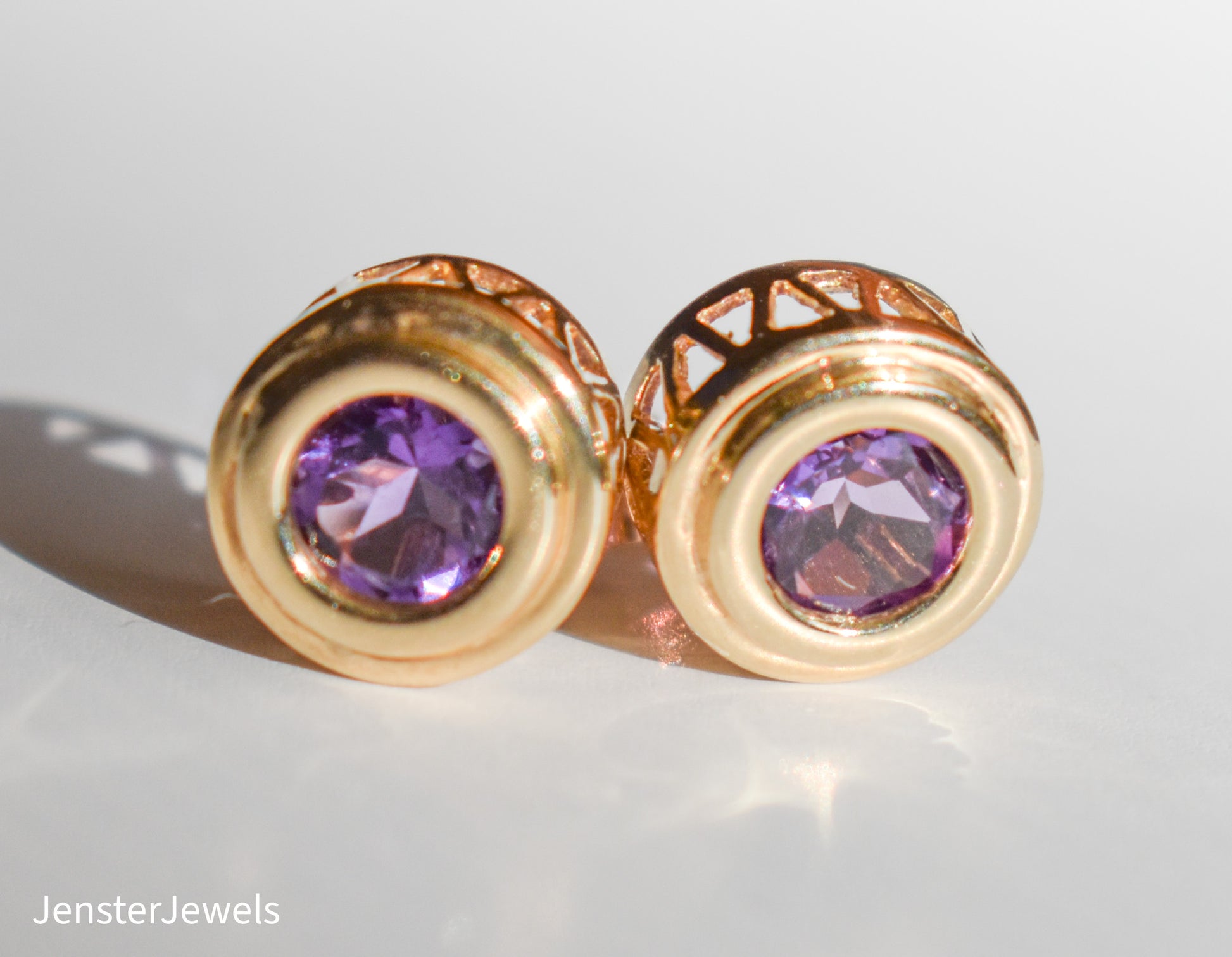 ★ Vintage 14K Yellow Gold Amethyst Bezel Set Circle Stud Earrings
