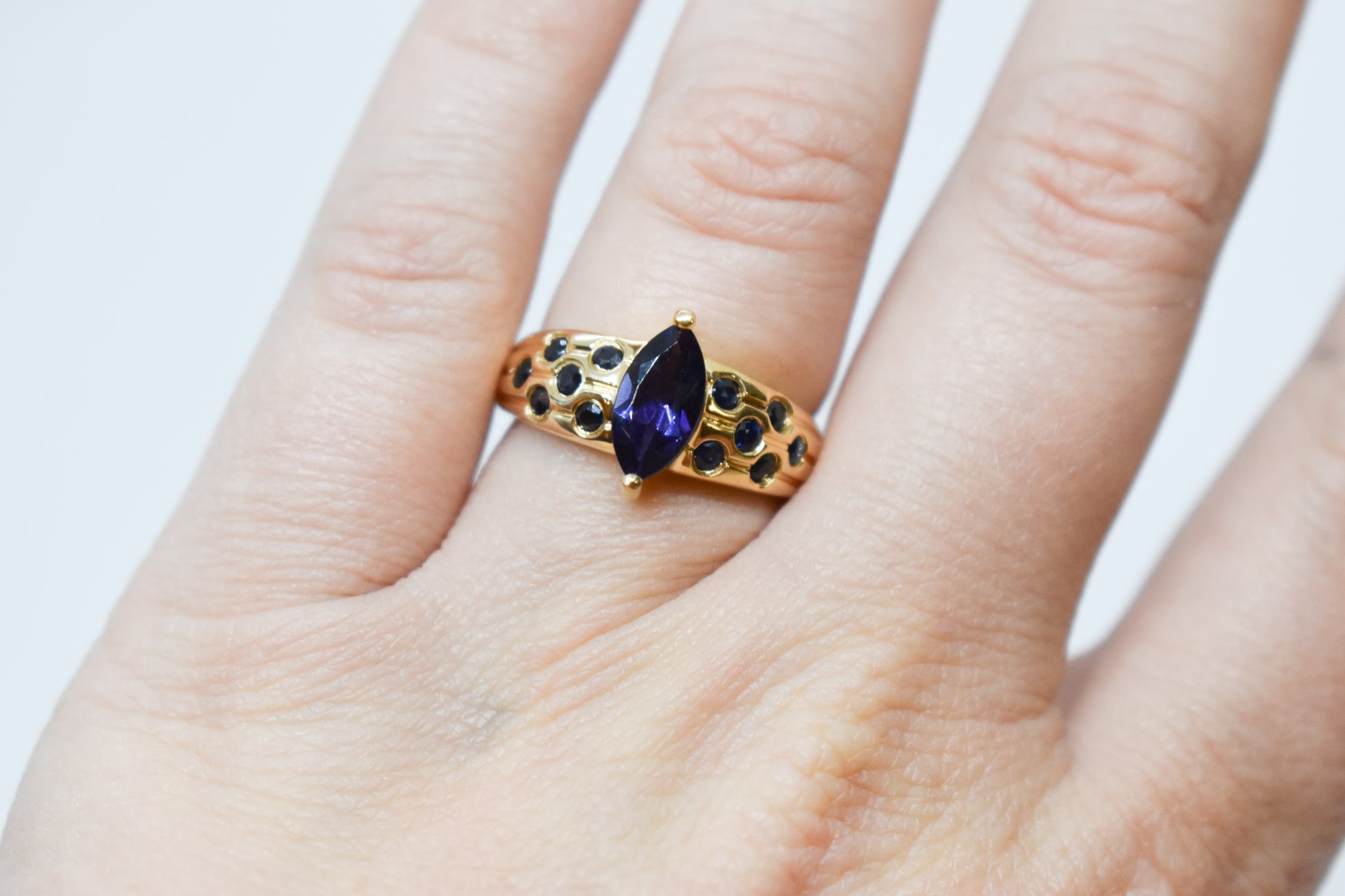This stunning vintage ring showcases a deep violet-blue marquise iolite accented by a halo of flush-set sapphires that shimmer along the gold band. The combination of rich hues and sleek gold makes it both eye-catching and elegant — perfect for gemstone lovers, September birthdays, or anyone who loves unique vintage treasures. 💙💜✨